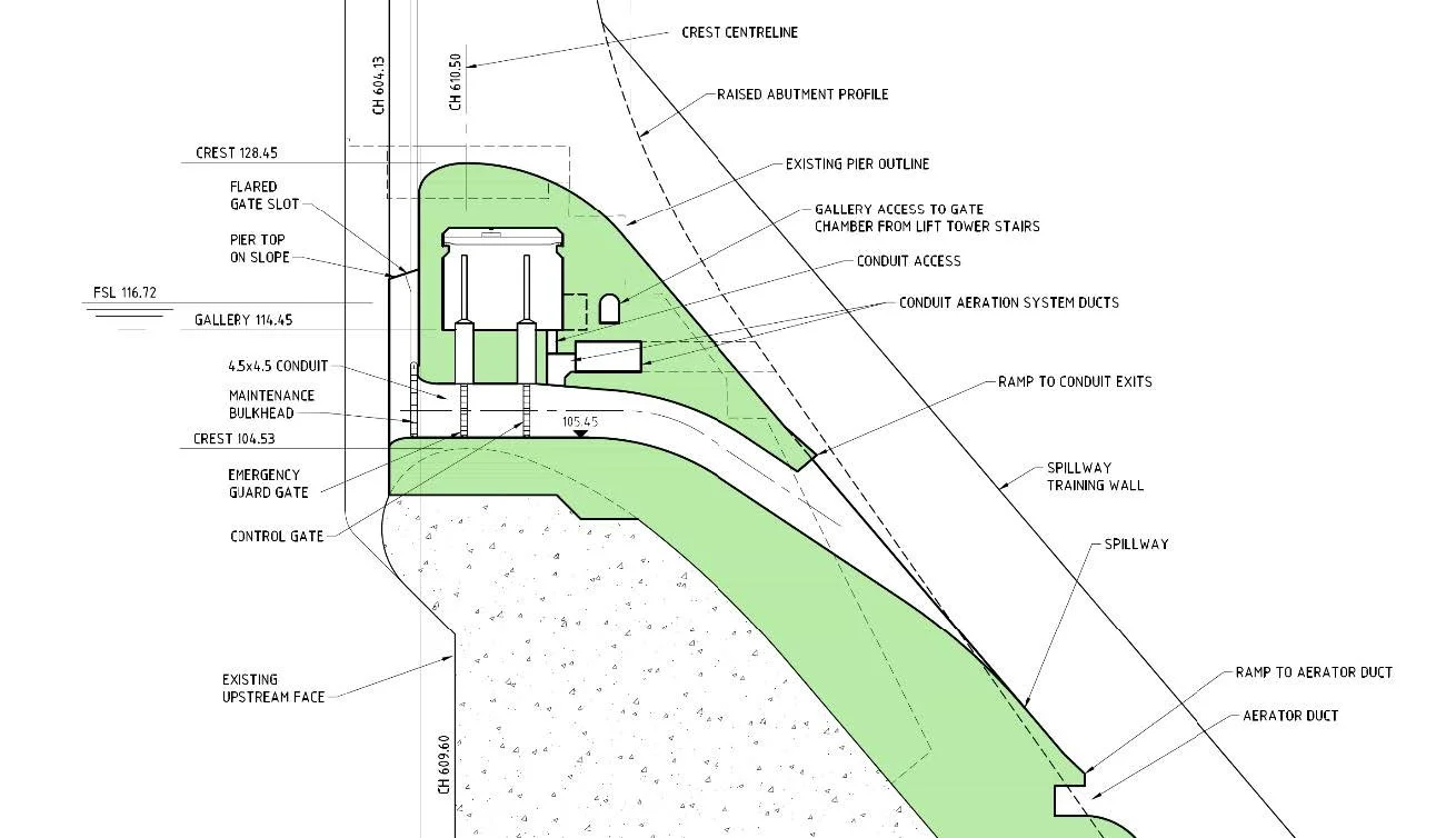The existing dam is 142 m high by 351 m long with the capacity to pass a flow of up to 45,000 m3/s of water during extreme flooding. The raising of the dam requires strengthening the dam structure to retain water to a higher level and upgrading hydraulic structures to safely pass inflows during a flood.